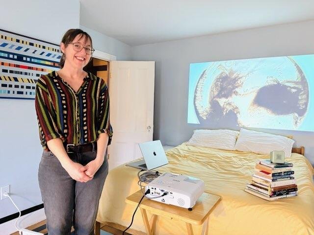 “My interdisciplinary practice spans writing, experimental filmmaking, and live performance and is often psychedelic, autobiographical and collaborative. As a writer, I’m interested in using genre (erotica, fantasy, self help, etc.) to access greater truths. My films are often a mix of formal and emotional investigation. As a mother and an artist, I tend to combine ‘home movies’ and studio experiments to create video poems, using the editing process to develop rhythm and find continuous threads in disparate imagery. My performance work combines dance, light and shadow, and physical materials to explore the relationship of internal to external landscapes.”