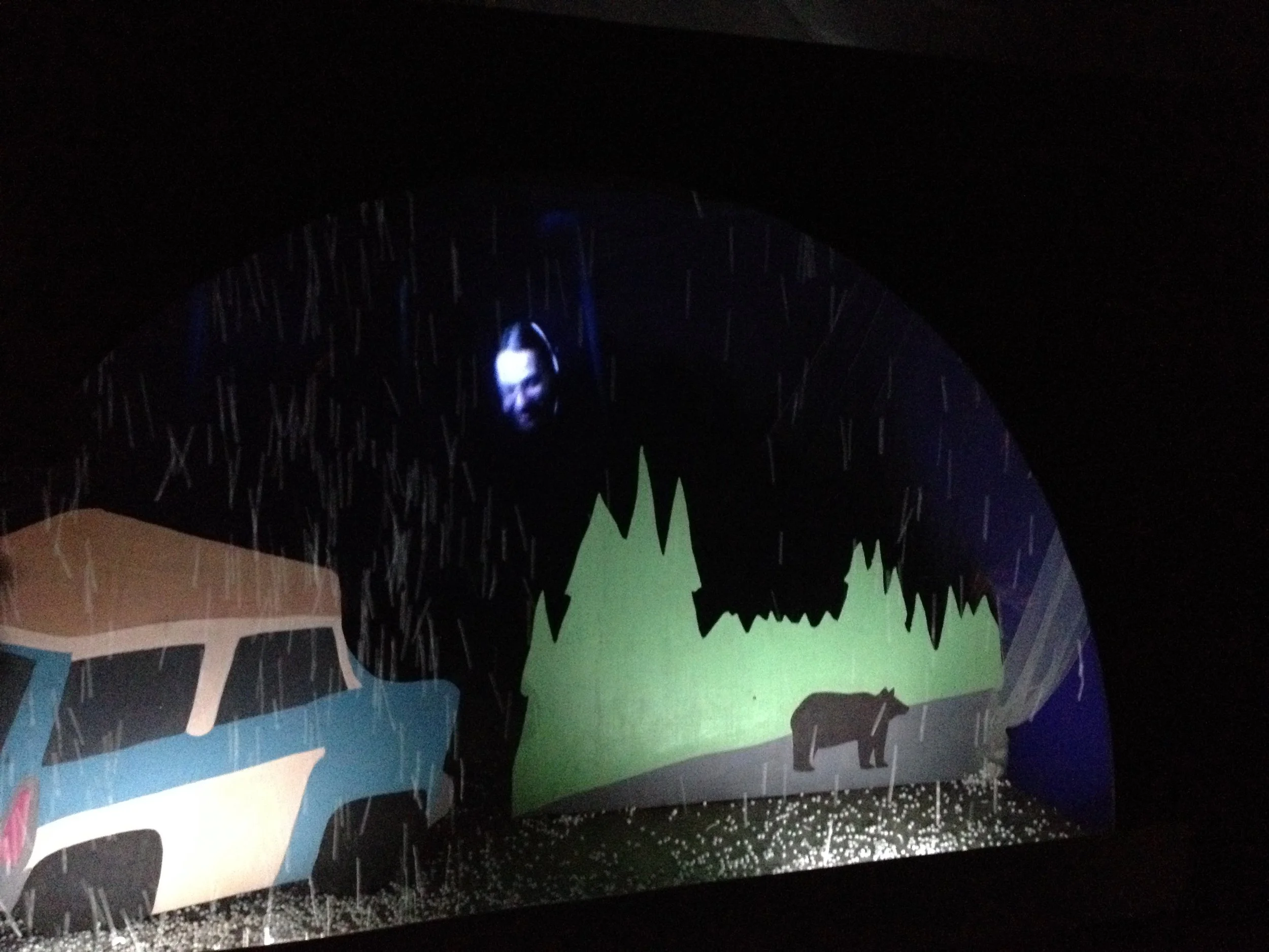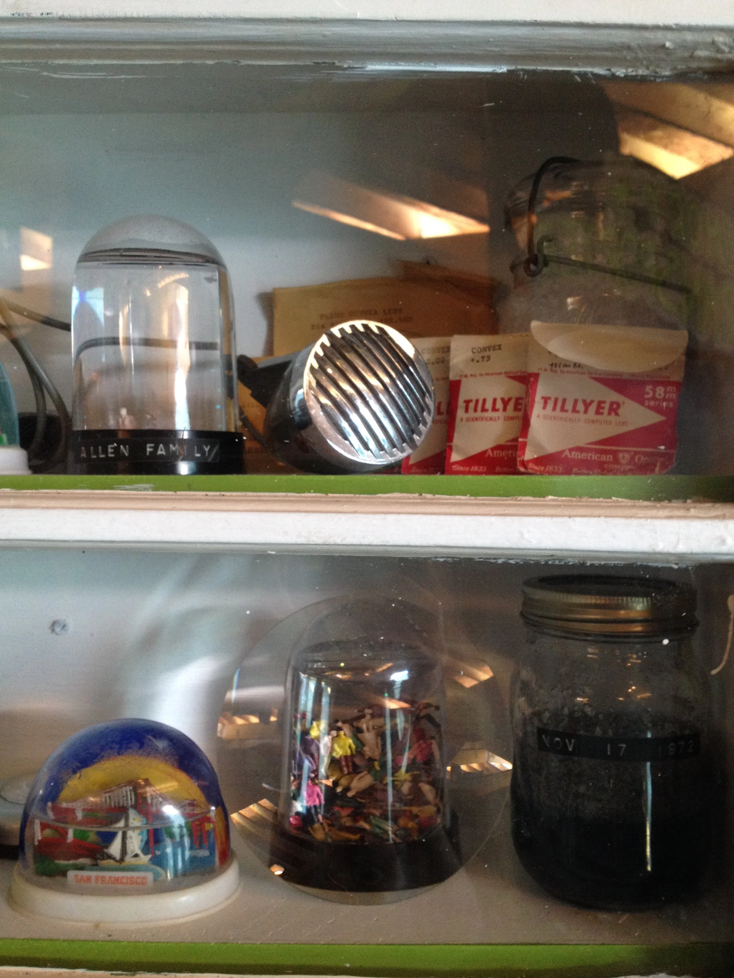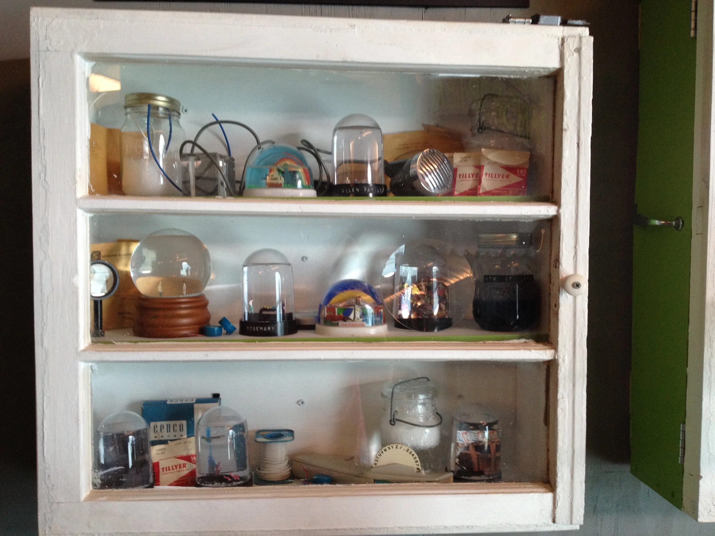 Multi-media installation created out of building materials, lab equipment and snow globes, hand-painted signs and charts, a homemade snow machine, translucent fabric and live video projection.